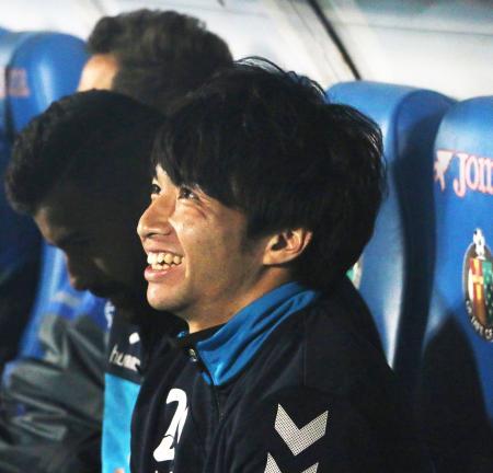 ベンチで笑顔を見せるテネリフェ柴崎(撮影・PNP)
